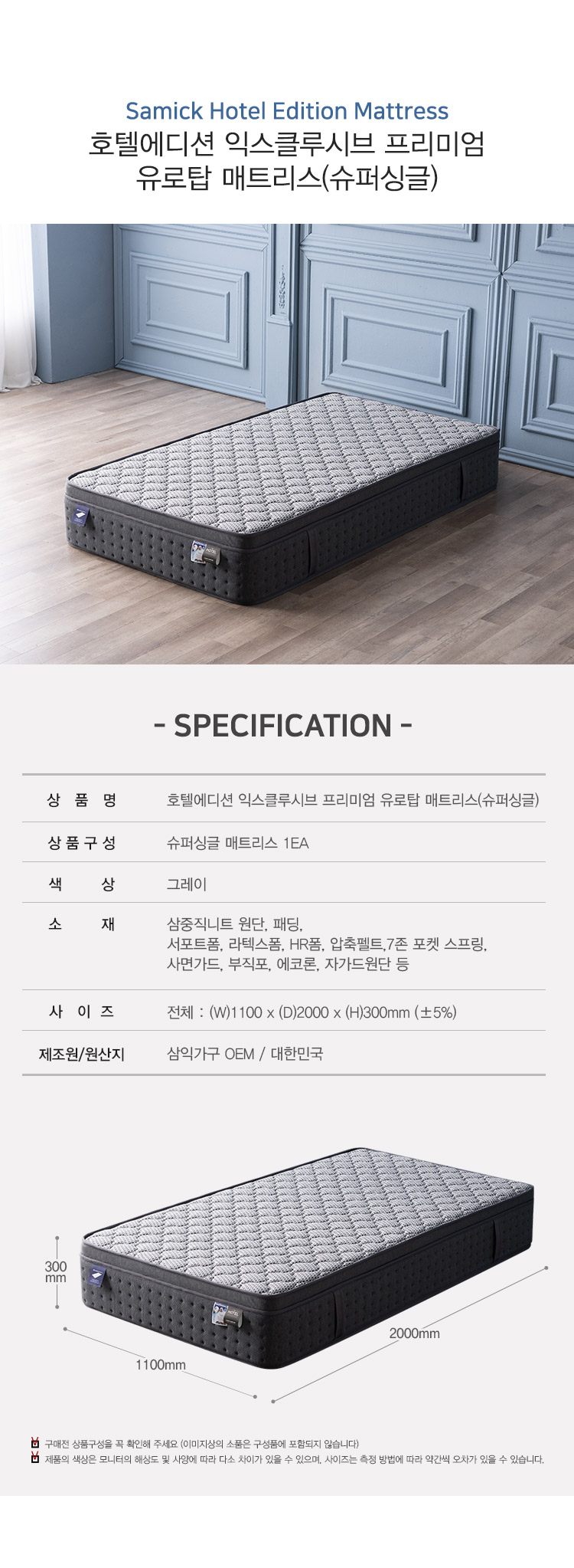 | 품명 및 모델명 | 호텔에디션 익스클루시브 프리미엄 유로탑 매트리스(슈퍼싱글) | ||