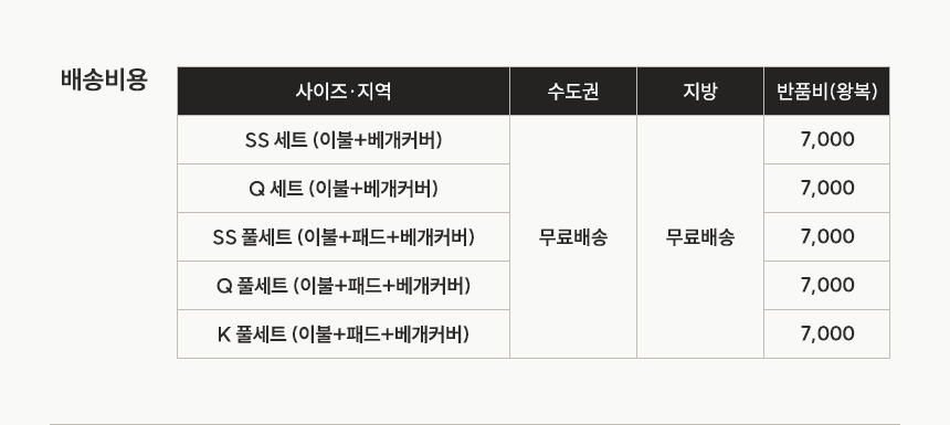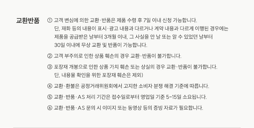 | 품질보증기준 | 품질보증기간은 제품불량의 경우 최초 구입일로 부터 1년이내 무상 A/S 가능하며, 교환 및 환불 피해보상은 재정경제부 고시 소비자 피해보상규정에 따릅니다. (보증기간이 지났거나 사용상의 부주의, 부당한 수리나 개조, 천재지변에 의한 고장이 발생할 경우 유상으로 부품교환,수리가 가능합니다.) | ||