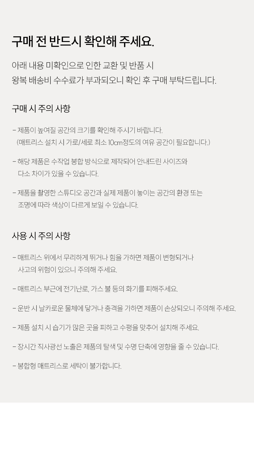 | 배송설치비용 | 1. 착불(도서지역/제주도 배송불가)2. 주문서확인 후 수도권 7일이내 지방 15일 이내 배송예정(공휴일 제외/영업일 기준)3. 가구 제품 특성 상 묶음배송불가4. 엘리베이터 사용료, 사다리차, 배송차량 주차료등 추가적인 발생비용은 고객님 부담입니다.5. 반품비용은 지역과 상품에 따라 변경될 수 있습니다. | ||