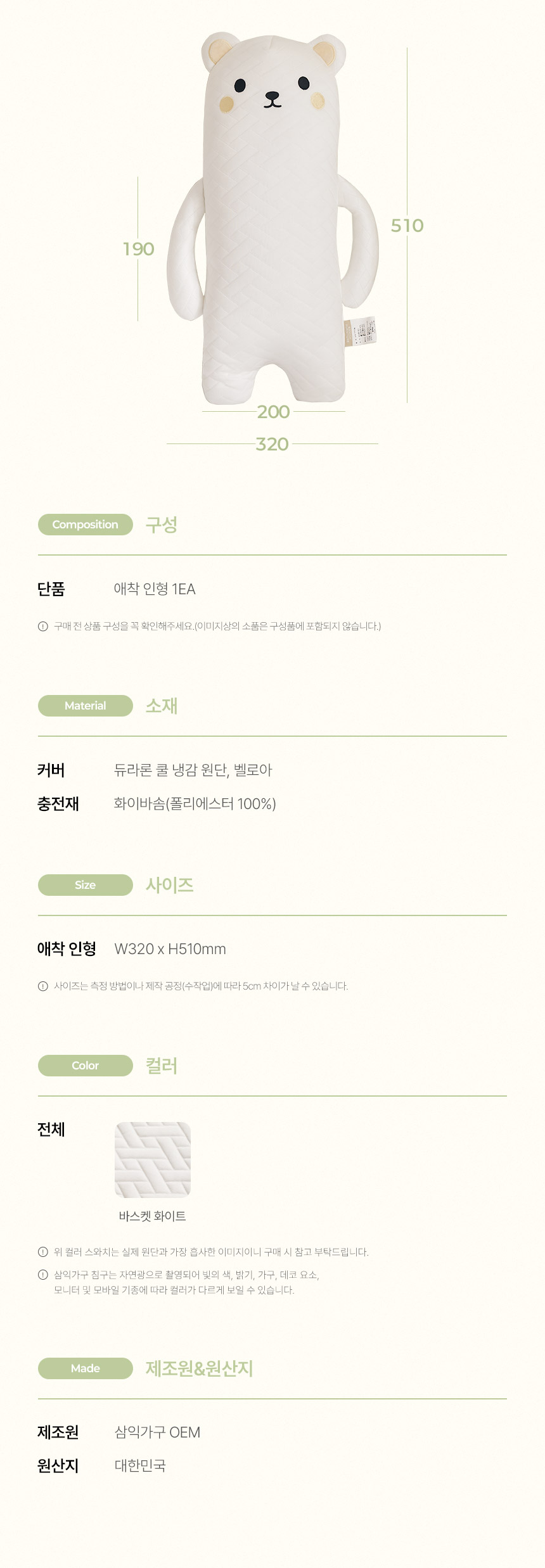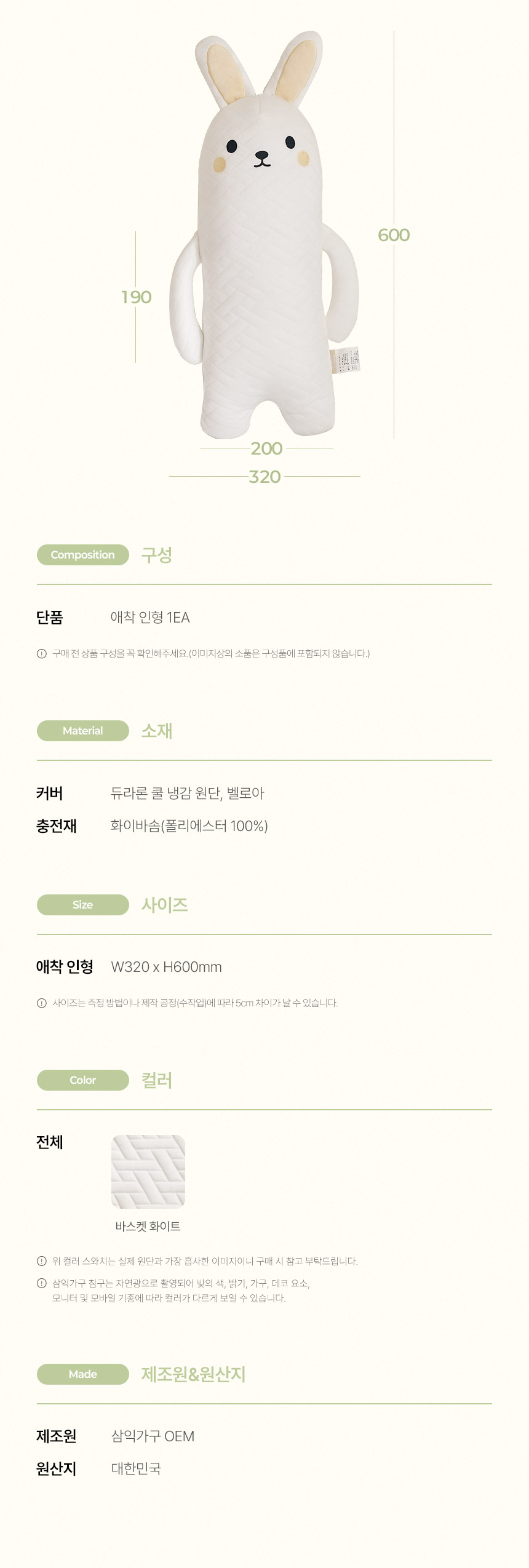 | 품명 및 모델명 | 쁘띠레브 듀라론 냉감 아기 애착인형 토끼 곰 유아 쿠션 | ||