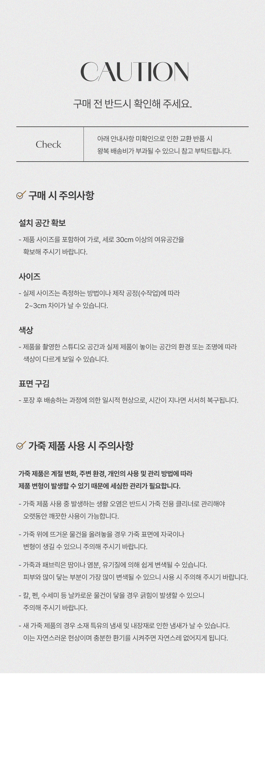 | 배송설치비용 | 1. 착불(도서지역/제주도 배송불가) 2. 주문서확인 후 수도권 7일이내 지방 15일 이내 배송예정(공휴일 제외/영업일 기준) 3. 가구 제품 특성 상 묶음배송불가 4. 엘리베이터 사용료, 사다리차, 배송차량 주차료등 추가적인 발생비용은 고객님 부담입니다. 5. 반품비용은 지역과 상품에 따라 변경될 수 있습니다. | ||
