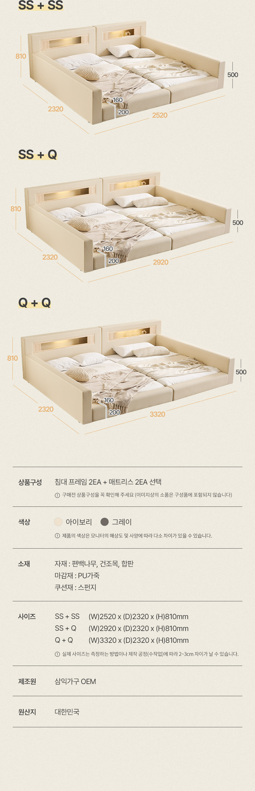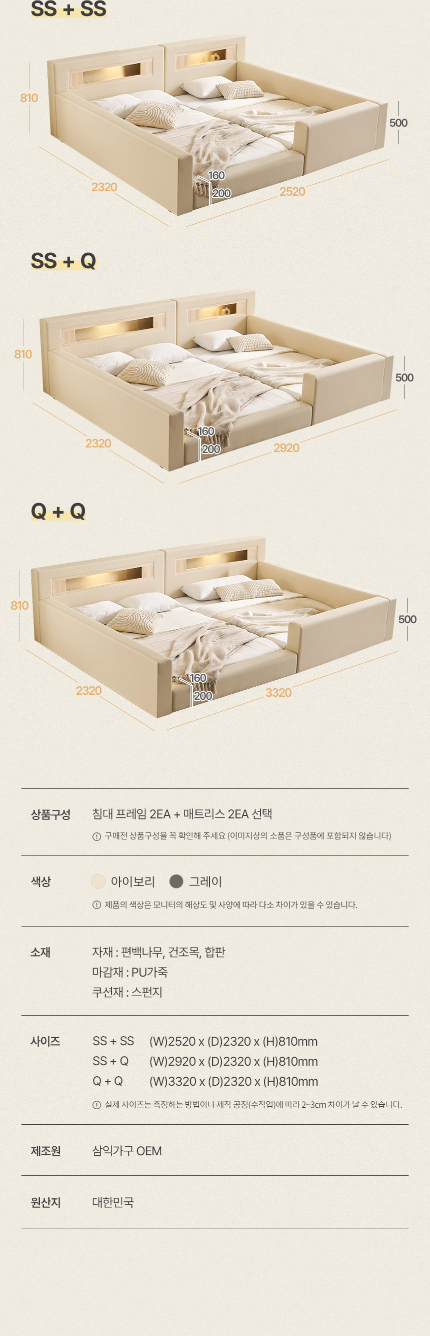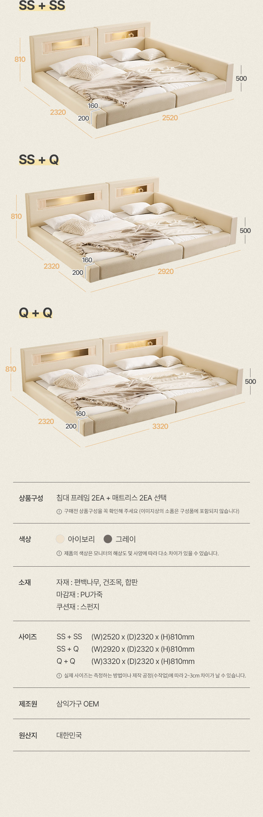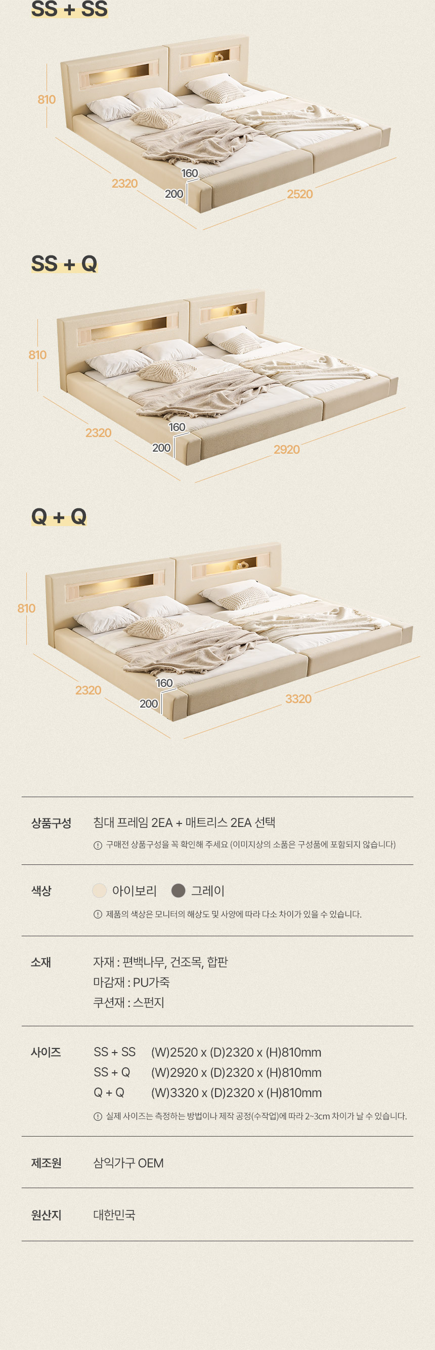 | 품명 및 모델명 | 포레티 편백나무 LED조명 가죽 패밀리 침대 (SS+SS/SS+Q/Q+Q) | ||